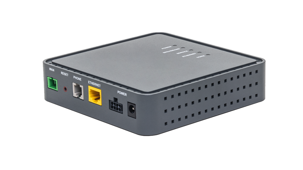 Notre modem GigaPoint® GP1100G est un terminal de livraison de services (ONU GPON) compact pour l’intérieur, capable d’atteindre 2,5 Gbps. Il offre une interface Ethernet Gigabit (GE) de 2,5 Gbit/s pour la transmission de services vidéo IPTV et de données, ainsi qu’une ligne vocale prenant en charge la VoIP de qualité opérateur (SIP). Le GP1100G est conçu pour fonctionner avec les terminaux d’accès optique GPON de la série E de Calix, leaders de l’industrie.